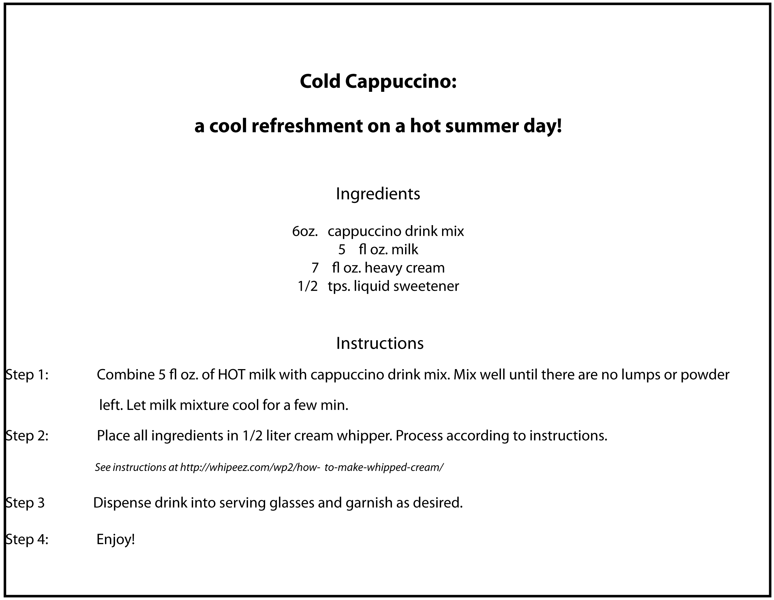 IMG_4305   This blog will be short and sweet. This cold cappuccino recipe is amazingly easy to make.   IMG_4303   So here we have a super simple cold cappuccino, the entire thing created in a whipping siphon (we recommend using our Whip-eez brand).   It’s yummy and serves perfect as a breakfast morning coffee, or an afternoon pick me up.   IMG_4302   When I say it’s amazingly easy to make I mean less than 5 min. to make.   We begin by warming up the milk and mixing it with the cappuccino drink mix. Stir well until all lumps are gone. (let cool for a few min.) Then we will place all ingredients in the whipped cream dispenser.   IMG_4296 IMG_4278   Screw on the top tightly, drop a N2o cream charger in the charger holder……   IMG_4285 IMG_4286   And screw on the charger holder to head. (You will hear the gas release into the dispenser)   IMG_4287   Now shake vigorously upside down over a sink for a few seconds. See more detailed instructions on using a cream dispenser Here ( https://whipeez.com/how-to-make-whipped-cream/ )   All done!   IMG_4294   Dispense into serving glasses with or without ice. Garnish as desired. We chose whipped cream!   IMG_4298     Thanks for reading! Visit us next week for more tips and cream whipper recipes from Whip-eez!       blpg#3