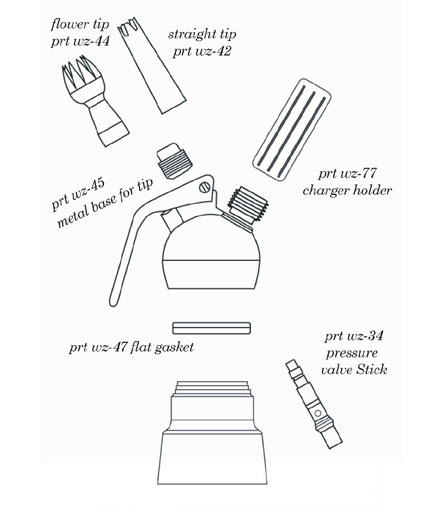 Before you can properly clean your whipped cream dispenser, you should know each of the parts:1) Decorating tip