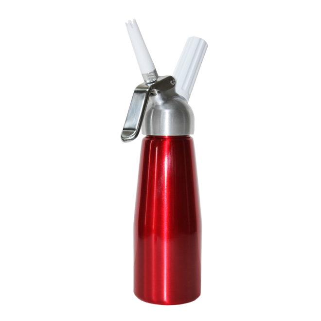 This 1/2 liter whipping canister is equipped with a specially designed strong and durable steel lever system allowing perfect dispensing and decorating.