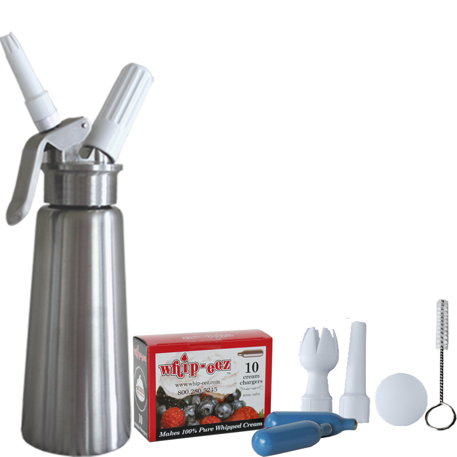 Holiday Special - $55.90 Lowest price offered on a stainless steel dispenser. While supplies last. Makes a great holiday gift or for making delicious desserts for all your special occasions. 1/2 Liter Stainless Steel Whipped Cream Dispenser - Comes with 1 free 10 pack of N2O cream chargers This Whip-eez cream whipper comes with a plastic charger holder and 3 decorating tips for making beautiful whipped cream.· Made with durable stainless steel